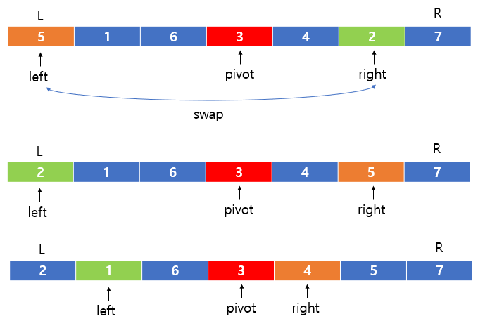 - 중간 값을 pivot으로 설정했다면 가장 왼쪽의 값을 left, 오른쪽의 값을 right로 잡는다. (여기서 L은 배열의 가장 왼쪽, R은 가장 오른쪽의 위치를 나타낸다)