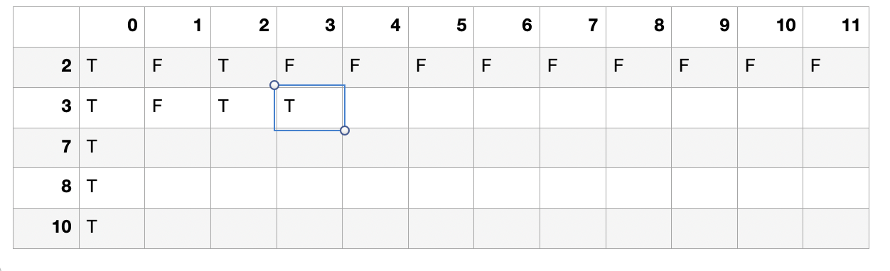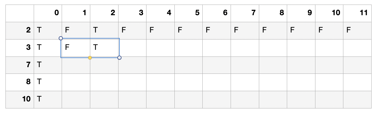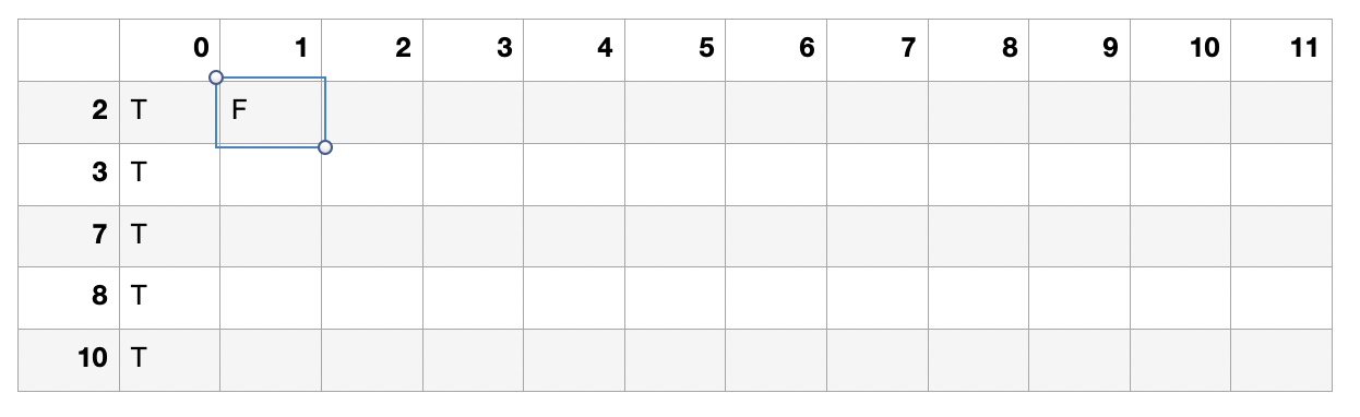2, 3, 7, 8, 10을 0개씩 쓰면 합이 0이 될 수 있으므로 첫 줄을 다 T로 채워준다.