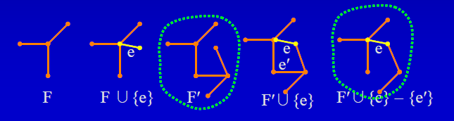 F'에서 cycle을 만드는 다른 edge e'을 제거하면 e가 F'에 들어갈 수 있게 됨.
