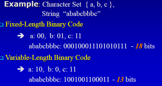 • text file을 표현하는데 variable-length binary code를 사용한다.