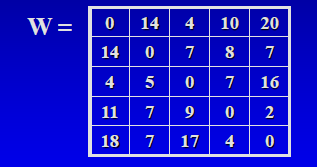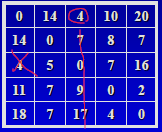 첫번째 행의 0은 v1-> v1의 가중치 , 14는 v1-> v2의 가중치