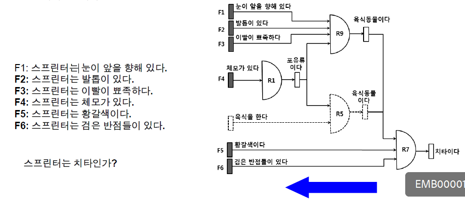 : 규칙의 조건부와 만족하는 사실이 있을 때 규칙의 결론부 실행 - 후향 추론(backward chaining, 역방향 추론)