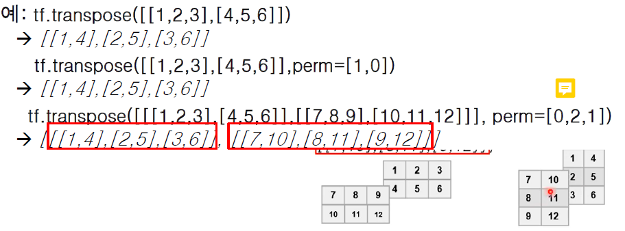 10. transpose(텐서, perm=[축의 순열]): 텐서의 지정된 축을 지정된 순서로 바꿈