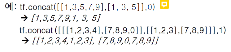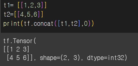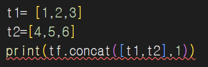 6. concat( [텐서 1, 텐서 2], 차원): 한 축을 기준으로 두 텐서를 이어 붙임(시작위치는 0부터 시작)