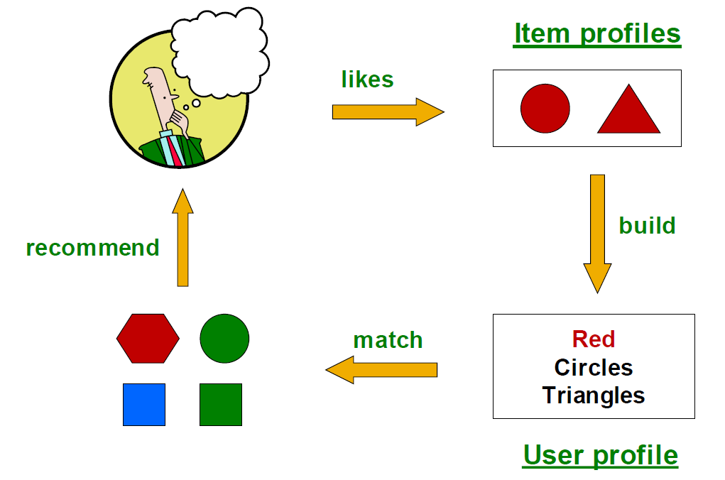 : 이전에 유저 x가 높게 평가한 item과 비슷한 item을 유저 x에게 추천하는 방법