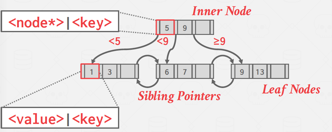 - 모든 B+Tree 노드는 키/값 쌍의 배열로 구성