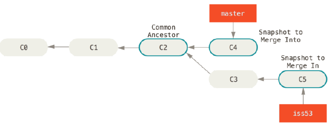 git은 각 브랜치가 가리키는 커밋 두개와 공통 조상 하나를 사용하여 3-way Merge를 한다.
