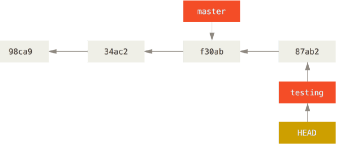 git checkout testing #HEAD는 testing 브랜치를 가리킨다.